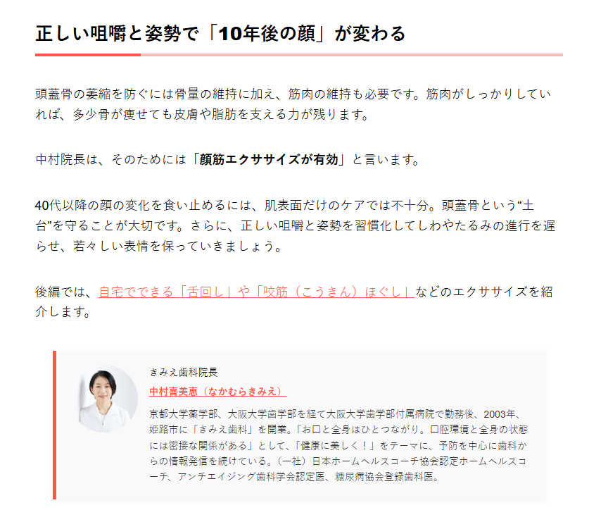 記事では、見た目の変化と密接に関わる頭蓋骨の構造や、噛み合わせ、歯の健康が顔の表情や輪郭に与える影響などについて、詳しくお話しさせていただきました。